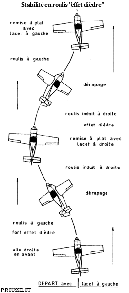 Ex : l’aile gauche se lève à la suite d’une perturbation. L’avion commence à déraper sur la droite. L’effet girouette due à la dérive engage l’avion dans une spirale à piquer. pour éviter cela, on mets du dièdre aux ailes. Ce dièdre à tendance à ramener l’avion à l’horizontale.