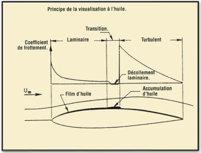 La zone laminaire est identifiée par une couleur de plus en plus foncée en partant du bord d’attaque jusqu’à la bulle de décollement laminaire (zone de transition) dans laquelle stagne l’huile (zone de recirculation, et donc d’accumulation d’huile et de pigments, augmentant le contraste sur la photo). Enfin la zone entièrement turbulente est matérialisée par une couleur claire qui s’obscurcit lorsqu’on approche du bord de fuite à cause de l’accumulation de l’huile à ce niveau.