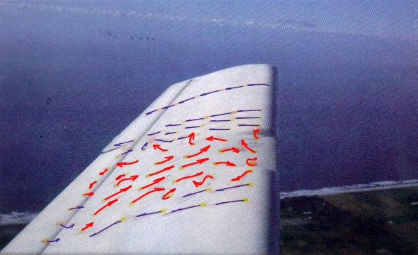 - L’appareil décolle, rejoint l’altitude de test et vole pendant environ 30 minutes. Le film d’huile, coloré par les pigments, s’écoule sur la paroi selon sa viscosité et la température, mais beaucoup plus rapidement dans la zone turbulente où la contrainte de frottement sur la paroi (contrainte pariétale) est la plus importante. La zone laminaire apparaît en plus foncée ou en plus claire, suivant les pigments utilisés et la couleur du revêtement de l’avion, du fait de la plus grande épaisseur du film d’huile.