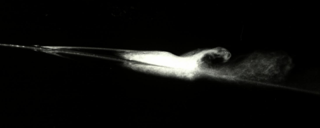 "Voilà de très intéressantes photos d’écoulement d’huile. Celle avec les turbulateurs placés à 6 mm en amont de la bulle est excellente car elle montre que cette bulle de séparation est bien supprimée et les écoulements adhèrent bien en amont et en aval des turbulateurs.