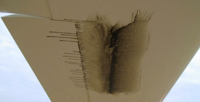 - On applique avec un pinceau un mélange à base d’huile de moteur automobile (par exemple, Mobil 1, 10W40 qui convient très bien pour des pressions dynamiques de 1500 N/m2, c.a.d des vitesses de 180 km/h), et de pigment colorant en poudre (oxyde ferrique Fe02, de couleur foncée, ou oxydes de titane Ti02, de couleur claire).