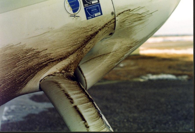 Sur cette photo nous pouvons voir, au milieu de la jambe de train, une zone d’accumulation d’huile correspondant à la zone de transition laminaire-turbulent de l’écoulement.