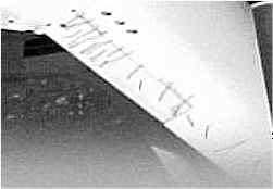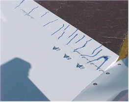 Après ce premier essai, Harry a fabriqué à l’aide d’une paire de ciseaux et d’une bande d’aluminium autocollante un ensemble de générateurs de vortex. Après quelques négociations avec le constructeur de l’appareil, Harry a installé six vortillons à environs trois pouces (7,5cm) en amont de la charnière intérieure de l’aile droite.
