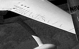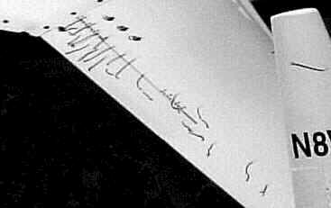Une fois encore, nous avons fait une série de photo de 100 à 70 nœuds. A 60 nœuds, Harry put voir que les fils de laine derrière les vortillons étaient complètement décollés de la surface avec un angle significatif et tourbillonnants. Suggérant que le décollement sur l’aileron résultait d’un angle d’incidence important, mais également, puisque les fils tournoyaient et toujours dans la direction longitudinale plutôt que dans le sens de l’envergure, que les générateurs de vortex semblaient essayer de faire leur travail en pénétrer la région séparée d’écoulement par l’intermédiaire d’énergiques tourbillons.