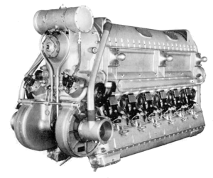 exhaust by peripheral ports in the liners and inlet valves in the head Twin fuel injection pumnps fed two injectors per cylinder, spraying tangentially to give swirl. Cylinder heads were made in unit for each bank, and a Lanchester torsional vibration damper was fitted to the rear of the crankshaft, presumably to offset any problematic vibrations caused by the narrow V format.