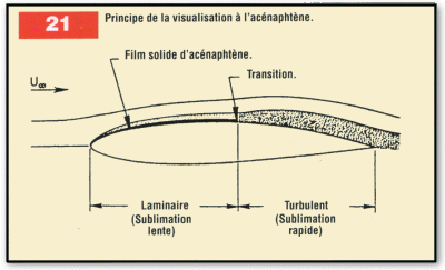Le temps de sublimation du revêtement d’acénaphtène est variable, suivant la température, la vitesse de l’écoulement, mais reste suffisant dans le cas du vol pour permettre le décollage, la montée, la descente et l’atterrissage sans altérer le résultat "développé" pendant le vol stabilisé aux conditions d’essais (Reynolds, vitesse et coefficient de portance donc incidence - voir le schéma de principe sur la figure 21 ci-contre).