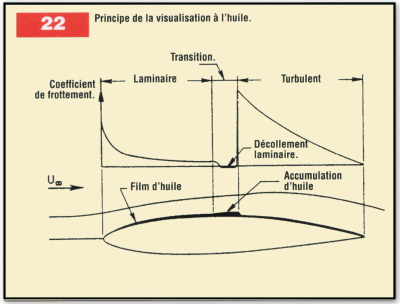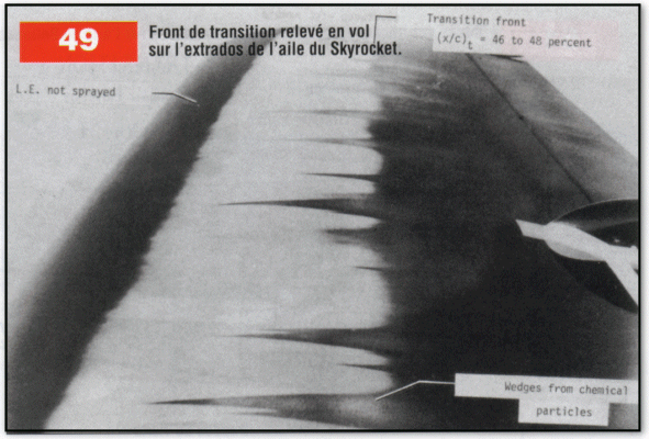 Le problème ne se pose évidemment pas en soufflerie où les conditions d’essais choisies sont constantes durant tout le temps nécessaire à la sublimation du film. Ce procédé, en vol comme en soufflerie, a un inconvénient, c’est que l’image de la transition correspond seulement au cas d’essai et pour chaque nouvelle condition (Re, Cz, ... etc), il faut recommencer le traitement. Mais il a aussi un avantage, dans le cas du vol car, une fois revenu au sol, l’expérimentateur a tout son temps pour examiner les résultats, photographier les fronts de transition sans avoir à voler en patrouille avec un avion "observateur" à ses côtés.