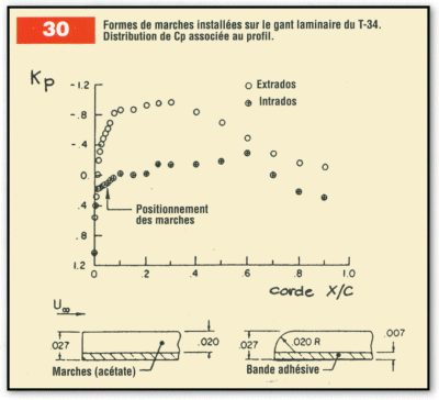 Des expérimentations récentes, en soufflerie et en vol sur deux avions différents (T-34C et Skyrocket), ont été effectuées par la Nasa (Réf. n’9) afin d’explorer ce domaine mal connu. Le T-34 "banc d’essai volant" est équipé d’un "gant laminaire" bordé de plaques de garde pour éviter la contamination turbulente du profil de base de l’avion. Un mini-gant laminaire est en plus installé tout contre le fuselage, dans le sillage d’hélice comme indiqué sur la figure 42.