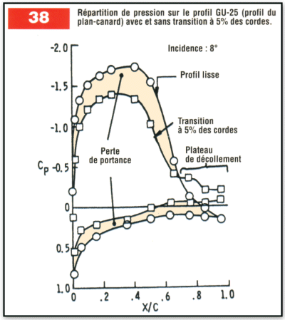 La figure 37 permet de constater une perte de portance d’environ 30%, entraînant une augmentation du moment piqueur de l’avion complet non négligeable. Un examen de la répartition 2D de pression sur le profil de type GU-25, équipant le canard, montre l’effet de la transition forcée à 5% des cordes. La perte de portance est due à un décollement, à l’extrados, de type bord de fuite (plateau de Kp à l’arrière du profil), occasionné certainement par l’épaississement de la couche limite turbulente dans la zone de forte recompression du profil après X/C = 50% (Fig. 38).