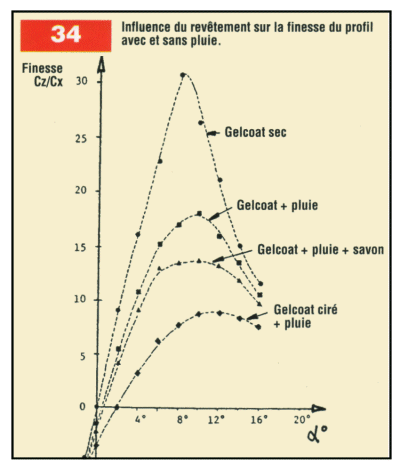 L’effet de la pluie tombant sur un profil laminaire a été étudié au MIT (Réf. N°8) sur un profil Wortmann FX-67-Kl7O, le nombre de Reynolds calculé sur la corde est de 350.000, et la précipitation réalisée en soufflerie est de 440 mm d’eau par heure. Ce profil a été soufflé avec trois types différents de revêtement pour simuler une "mouillabilité variable". Une surface "mouillable" voit le liquide s’étaler complètement sur la surface avec un angle de contact de 0°. A l’opposé, une surface non "mouillable" présente un angle de contact de 180°, et le liquide reste à la surface sous forme de goutte. Des valeurs intermédiaires sont envisageables. Lors de l’expérience, la surface de base était un gelcoat époxy, poncé soigneusement au grain 600, donnant un angle de contact de 53°. Une surface non "mouillable" a été obtenue en enduisant le profil avec de la cire, et un revêtement intermédiaire a été obtenu en savonnant la surface du profil. Les figures 34 et 35 montrent les résultats obtenus : 75% de réduction de finesse max entre le profil de référence (sec) et le profil ciré (non mouillable), et "seulement" 45% entre le profil sec et le profil savonné.
