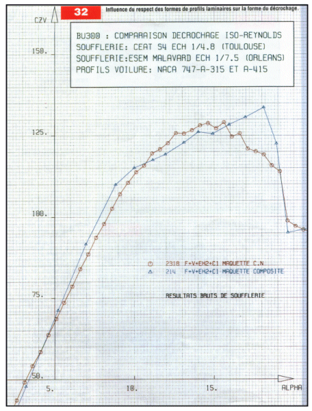 Par contre, la courbe de portance - Cz = f(alpha) - de la maquette "commande numérique", essayée dans une soufflerie du Centre d’essais aéronautiques de Toulouse (CEAT), présente un comportement assez voisin des résultats en 2D auquel on peut s’attendre, bien que les nombres de Reynolds "soufflerie" et "catalogue Naca" soient différents. Cet exemple montre bien l’importance d’une réalisation précise des profils laminaires afin d’obtenir les résultats prévus en dehors des incidences usuelles d’optimisation. Il faut noter toutefois que la technique des moules perdus semble satisfaisante pour la construction de profils d’ailes à l’échelle grandeur, la même précision absolue entraînant des écarts relatifs plus faibles. Il convient d’être malgré tout très soigneux dans le respect des cotes théoriques de profils laminaires à maître couple reculé.