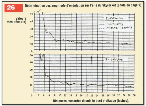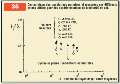La figure 25 présente une comparaison effectuée entre des ondulations admissibles, utilisant ce dernier critère, et des ondulations mesurées sur les surfaces portantes (ailes, canards, empennages, winglets) de différents appareils de construction amateur ou industrielle. Cette comparaison est basée sur un longueur d’onde de deux pouces (50,8 mm), et l’on peut voir sur cette dernière figure qu’il n’y a pas d’ondulation excédant la valeur critique empirique. Le critère ayant été établi pour des vitesses max et à basse altitude, les ondulations critiques à ne pas dépasser seront sensiblement plus grandes pour des nombres de Reynolds correspondant à la croisière à plus haute altitude (application de la formule ci-dessus)