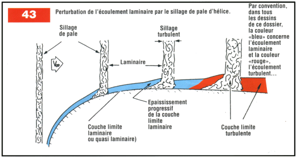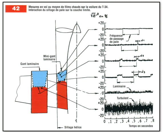 Une explication a été donnée par les spécialistes de la Nasa. Elle consiste à faire l’hypothèse que l’impact cyclique du sillage turbulent, émis par le bord de fuite de la pale (comparable à la nappe tourbillonnaire issue d’une aile) sur la couche limite, est transformé en "petites bouffées turbulentes" s’écoulant vers l’aval d’une façon cohérente et régulière. Alors, comme le montre les signaux e’ des films chauds, entre ces bouffées transitionnées, la couche limite doit être naturellement et normalement laminaire. Ce concept est illustré de façon schématique par la figure 43. Quelle est la conséquence sur le plan quantitatif ? Un essai a été réalise en soufflerie sur un profil laminaire de type Naca 66-018 avec et sans la présence d’un sillage d’hélice et a incidence nulle.