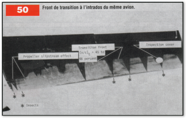Sur la figure 51, les tracés des fronts intrados et extrados permettent de voir clairement l’effet de l’hélice (diminution de la surface laminaire à l’intérieur du sillage hélice), et le déclenchement de la transition pratiquement au droit des trappes de visite.