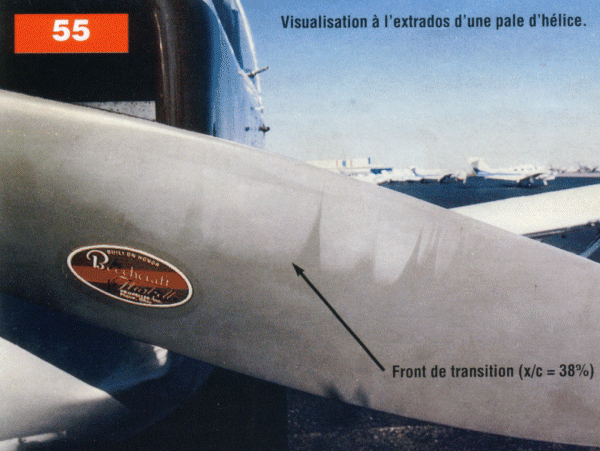 Enfin la figure 55 montre qu’il peut exister aussi un écoulement laminaire sur une pale d’hélice (partie extrados de la pale), cette dernière pouvant être considérée comme une voilure en rotation.