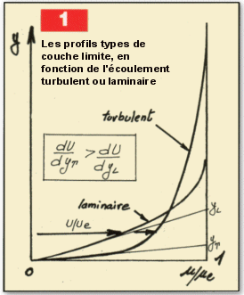 La partie gauche de cette relation indique que Tp est proportionnel à m, viscosité de l’air, et au gradient de vitesse à la paroi (du/dy). Cette relation appliquée successivement à un écoulement de type laminaire puis turbulent permet de comprendre simplement la différence quantitative entre frottement laminaire et turbulent. L’expérience montre (peignage de la couche limite avec un tube Pitot) que les profils de vitesse diffèrent sensiblement comme le montre la figure 1. Le profil de vitesse turbulent est beaucoup plus plein que le laminaire, et la vitesse locale à une hauteur donnée de la paroi est plus importante qu’en laminaire : l’écoulement accélère plus vite en s’éloignant de la paroi pour une couche limite turbulente. A partir de la figure 1, il est facile de voir que le gradient de vitesse du/dy à la paroi est bien plus important en turbulent qu’en laminaire, et en revenant à l’expression de la relation 1, que la contrainte de cisaillement ou bien le coefficient de frottement local Cf apparaissant dans la partie droite de la relation est plus important.