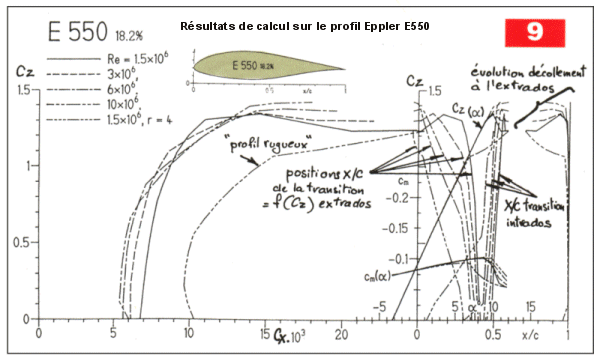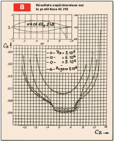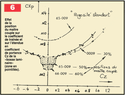 La figure 6, relative à un profil symétrique, montre que si le recul du maître-couple diminue le Cxp, la plage de traînée minimum ("bosse laminaire ") voit son étendue diminuer. En effet, en incidence la transition apparaît plus vite à l’extrados pour le profil à maître-couple reculé (recompression plus importante à l’extrados après le minimum de pression). Cette figure 6 illustre bien aussi la notion de taux d’échange (compromis) lors du choix de profil par le concepteur : à égalité de nombre de Re, il est possible de diminuer la valeur du Cxp min, mais au détriment de la plage de portance pour laquelle ce coefficient de traînée est minimum. Autrement dit, on échange un faible Cxp sur une plage donnée de Cz contre un Cxp plus élevé, mais sur une plage de portance plus vaste.