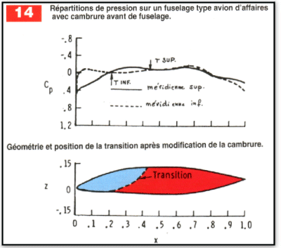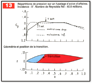 La figure 12 présente les résultats théoriques et expérimentaux obtenus sur un corps de révolution de rapport "longueur de fuselage sur diamètre du maître-couple " de l’ordre de 4,5 et pour une incidence de O°. L’état de surface correspond au " poli aérodynamique", et le nombre de Re calculé sur la longueur de fuselage total est de $13,4.10^6$. L’expérience et le calcul s’accordent bien pour prédire un emplacement de transition vers 68% de la longueur du corps, légèrement après la position du minimum de pression . Ce résultat, obtenu sur un fuselage quelque peu " académique" permet malgré tout d’apprécier l’étendue de laminarité qu’il est possible d’obtenir pour un nombre de Reynolds donné. L’exemple de la figure 13 représente un fuselage type avion d’affaires (Piaggio Avanti par exemple), et ce résultat est beaucoup plus transposable à un projet d’avion léger à propulsion arrière avec cabine intégrée. Le nombre de Reynolds est de $40,8.10^6$, ce chiffre correspond à un fuselage de 7 mètres de longueur se déplaçant à la vitesse de 74 m/s (265 km/h) à 0 m d’altitude. Les courbes de coefficient de pression, tracées sur les méridiennes inférieure et supérieure, permettent de se rendre compte que là aussi, les transitions apparaissent peu après la position du minimum de pression.