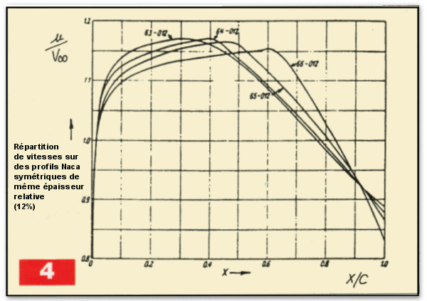 Cette façon de faire entraîne vite des limitations, on ne peut rechercher l’extension maximum de laminarité sans se préoccuper des conséquences induites sur le fonctionnement du profil. La figure 4 montre que plus on recule le maître-couple, plus la recompression (dKp/dX) est grande après le minimum de pression. Une comparaison, entre un profil symétrique ancien (NACA 0012) et un profil laminaire moderne, illustre bien l’influence de la position du maître-couple sur la forme de la répartition de vitesse (figure 5).