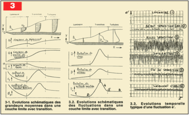 La figure 3-1 montre les évolutions schématiques des grandeurs moyennes dans une couche limite avec transition, tandis que la figure 3-2 montre l’évolution des fluctuations. Le passage de laminaire à turbulent entraîne des modifications sensibles de ces paramètres qui seront utilisés ultérieurement dans les prochains chapitres. La figure 3-3 présente un évolution temporelle typique (relevé de vol) d’une fluctuation e’ pouvant être, après étalonnage, transformée en contrainte pariétale Tp’. Pour revenir au phénomène physique concernant le changement de régime, tout le monde peut faire l’expérience du robinet ou observer la fumée d’une cigarette : à une certaine distance du robinet ou de la cigarette, l’écoulement cesse de se produire par tranches bien parallèles et devient désordonné. Ces constatations simples sont de même nature que celles apparaissant sur la figure 3, concernant la plaque plane. La valeur du nombre de Reynolds de transition sur plaque plane est voisine de 500.000 (Re critique). Plusieurs causes interviennent dans le mécanisme du déclenchement de transition, et parmi celles-ci on peut noter :