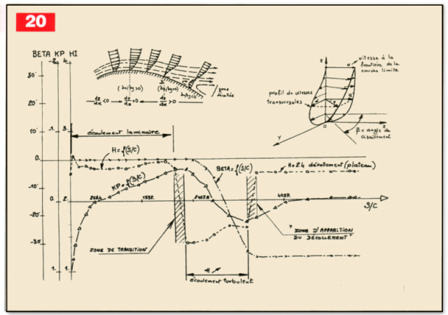 a) Laminarité sur les profils d’ailes : avant d’examiner plus en détail le comportement de la couche limite sur les profils, il est souhaitable de faire la remarque suivante : " Il n’existe pas plus de profils laminaires que de profils turbulents". Ces expressions sont trompeuses, car on pourrait croire que certains profils sont laminaires jusqu’au bord de fuite, et d’autres turbulents dès le bord d’attaque. Si cette dernière notion est employée dans les calculs théoriques pour initialiser un calcul avec un point d’arrêt turbulent, il n’en reste pas moins vrai que tout profil comporte dans la réalité une partie laminaire, qui peut évidemment être réduite à quelques petits pour cent de corde.