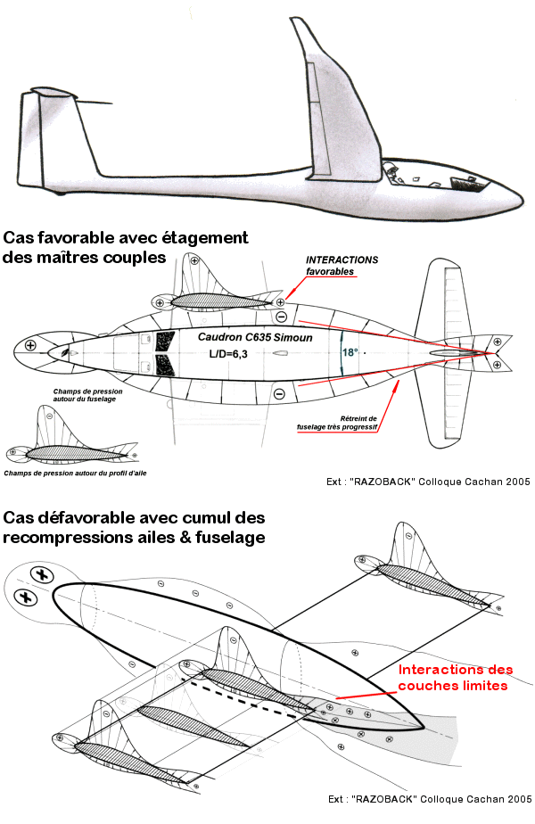 Sur avion, cela est beaucoup plus difficile en raison de la masse du GMP à l’extrême avant, et du passage du longeron là où se trouve les masses variables… des occupants. De fait, les maîtres-couples s’additionnent presque toujours, ce qui a pour effet de maximiser les traînées d’interaction dues au champ de pression autour de l’avion. Si, en outre, on a le malheur de combiner un rétreint de fuselage juste en arrière de ce pic de variation de pression, on accroit encore un peu plus les interactions.