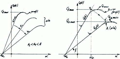 2) sur la vitesse minimale de vol : la rotation de la courbe dans le sens d’une diminution du gradient de portance impliquant une diminution du Czmax, il s’en suit que la vitesse minimale de vol est effectivement plus faible lorsque l’allongement diminue. Il est à noter aussi que l’angle d’incidence atteint sera sensiblement plus important. Attention donc aux cordes trop grandes qui imposent un cabré trop grand de l’appareil qui peut ne pas être exploitable...
