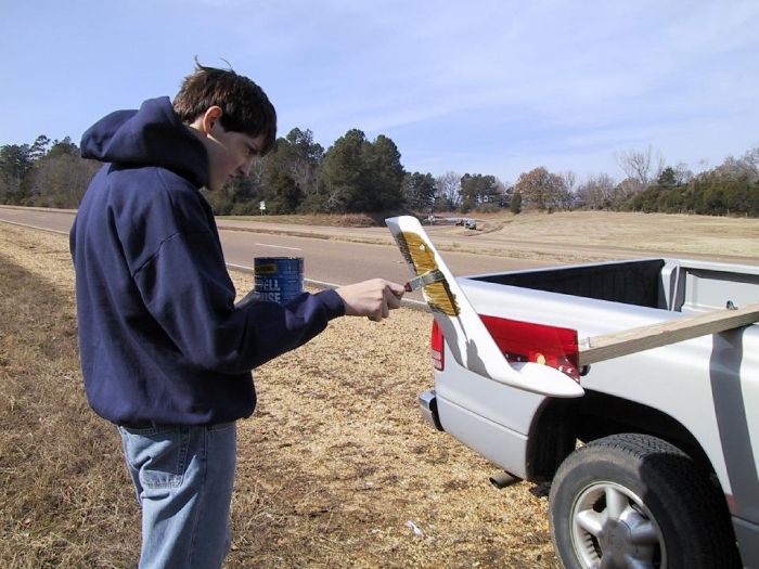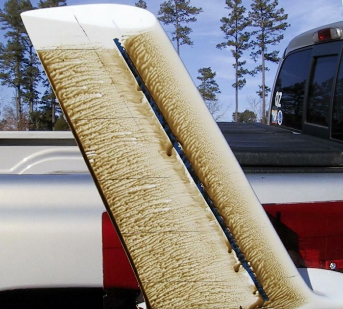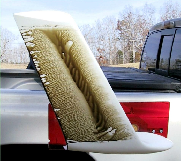 - On applique avec un pinceau un mélange à base d’huile de moteur automobile (par exemple, Mobil 1, 10W40 qui convient très bien pour des pressions dynamiques de 1500 N/m2, c.a.d des vitesses de 180 km/h), et de pigment colorant en poudre (oxyde ferrique Fe02, de couleur foncée, ou oxydes de titane Ti02, de couleur claire).