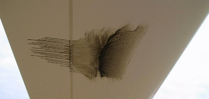 - L’appareil décolle, rejoint l’altitude de test et vole pendant environ 30 minutes. Le film d’huile, coloré par les pigments, s’écoule sur la paroi selon sa viscosité et la température, mais beaucoup plus rapidement dans la zone turbulente où la contrainte de frottement sur la paroi (contrainte pariétale) est la plus importante. La zone laminaire apparaît en plus foncée ou en plus claire, suivant les pigments utilisés et la couleur du revêtement de l’avion, du fait de la plus grande épaisseur du film d’huile.