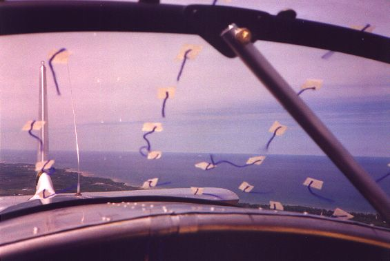 Les fils de laine situés au zénith de la verrière sont à peu près alignés avec le vent relatif. Par contre, plus en arrière, ils adoptent des directions erratiques traduisant des décollements importants.