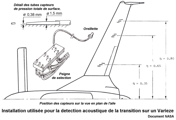 - Les données acoustiques sont enregistrées manuellement en vol. La couche limite laminaire est plus silencieuse que la couche limite turbulente. Il faut donc étalonner chaque tube. A chaque vitesse de vol, les trois tubes situés sur la même corde sont écoutés un à un. Quand un tube est sélectionné sur le peigne, le signal sonore est étalonné en effectuant une manoeuvre qui provoque un facteur de charge de 2G (par exemple un virage à 60° d’inclinaison). Cette manoeuvre à pour effet d’augmenter l’incidence de l’aile et de provoquer une avancée significative de la zone de transition devant le tube sélectionné. De cette manière chaque tube peut être étalonné indépendamment de sa réponse acoustique particulière.