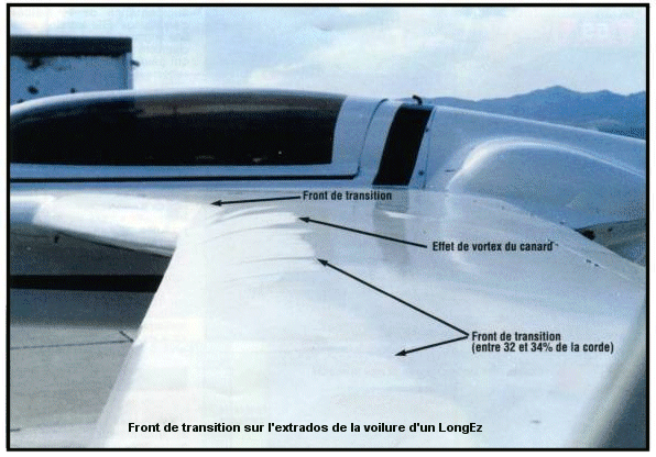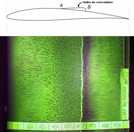 Aux angles d’incidence usuels, la couche limite transite d’un écoulement laminaire en écoulement turbulent en un certain point de la corde de l’aile. Cette zone de transition est matérialisée par une bulle de recirculation qui "épaissit" l’aile en ce point.