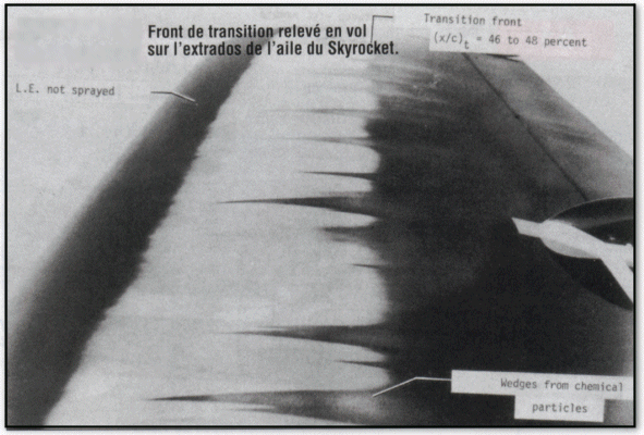 Pour les analyses de transition laminaire/turbulent, on a tout intérêt à fixer une bande crantée (bande rugueuse ou de papier de verre) dans le sens de l’envergure sur une longueur limitée (50 cm), qui puisse servir de témoin pour identifier l’aspect de la zone de transition laminaire/turbulent.