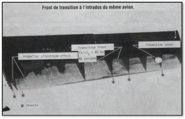 La zone laminaire est identifiée par une couleur de plus en plus foncée en partant du bord d’attaque jusqu’à la bulle de décollement laminaire (zone de transition) dans laquelle stagne l’huile (zone de recirculation, et donc d’accumulation d’huile et de pigments, augmentant le contraste sur la photo). Enfin la zone entièrement turbulente est matérialisée par une couleur claire qui s’obscurcit lorsqu’on approche du bord de fuite à cause de l’accumulation de l’huile à ce niveau.