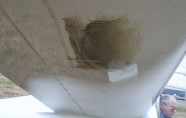 Sur cette photo nous pouvons voir, au milieu de la jambe de train, une zone d’accumulation d’huile correspondant à la zone de transition laminaire-turbulent de l’écoulement.