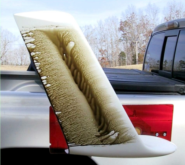 En outre, cette méthode de diagnostic permet de visualiser l’influence des différentes protubérances telles que les écopes d’air, les venturis, les antennes et la direction locale de l’écoulement. On pourra ainsi facilement orienter les écopes dans le sens du flux.