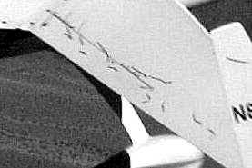 Une fois encore, nous avons fait une série de photo de 100 à 70 nœuds. A 60 nœuds, Harry put voir que les fils de laine derrière les vortillons étaient complètement décollés de la surface avec un angle significatif et tourbillonnants. Suggérant que le décollement sur l’aileron résultait d’un angle d’incidence important, mais également, puisque les fils tournoyaient et toujours dans la direction longitudinale plutôt que dans le sens de l’envergure, que les générateurs de vortex semblaient essayer de faire leur travail en pénétrer la région séparée d’écoulement par l’intermédiaire d’énergiques tourbillons.