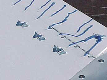 Après ce premier essai, Harry a fabriqué à l’aide d’une paire de ciseaux et d’une bande d’aluminium autocollante un ensemble de générateurs de vortex. Après quelques négociations avec le constructeur de l’appareil, Harry a installé six vortillons à environs trois pouces (7,5cm) en amont de la charnière intérieure de l’aile droite.