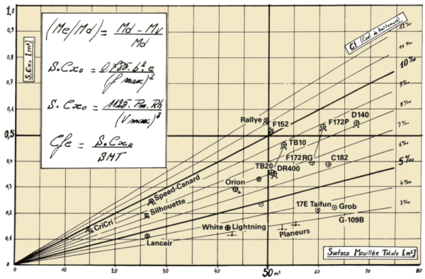 Avec la surface mouillée totale (surfaces qui "frottent" contre l’air) vous serez en mesure de comparer le coefficient de frottement de l’avion (avec l’intégration de toutes les rugosités, les ondulations de surface, les traînées de culot, le train, etc.) et la comparer avec celle d’une plaque plane parallèle au vent relatif dont on sait par les mesures en soufflerie qu’elle est égale (aux vitesses qui nous intéressent) à 0,003. L’écart à cette valeur donnera une idée de la plus ou moins bonne réussite aérodynamique de l’appareil, indépendamment de sa taille et de sa catégorie. A titre d’exemple, les planeurs sont très proches de 0,003. L’Orion tourne autour de 0,0065. Le Speed-Canard : 0,009 et le Rallye : 0,011. Les meilleurs réussites aérodynamiques se trouvent chez les amateurs avec le Lancair et le White Lightning qui se situent entre 0,0032 et 0,004 (imprécision due au manque de données fiables).