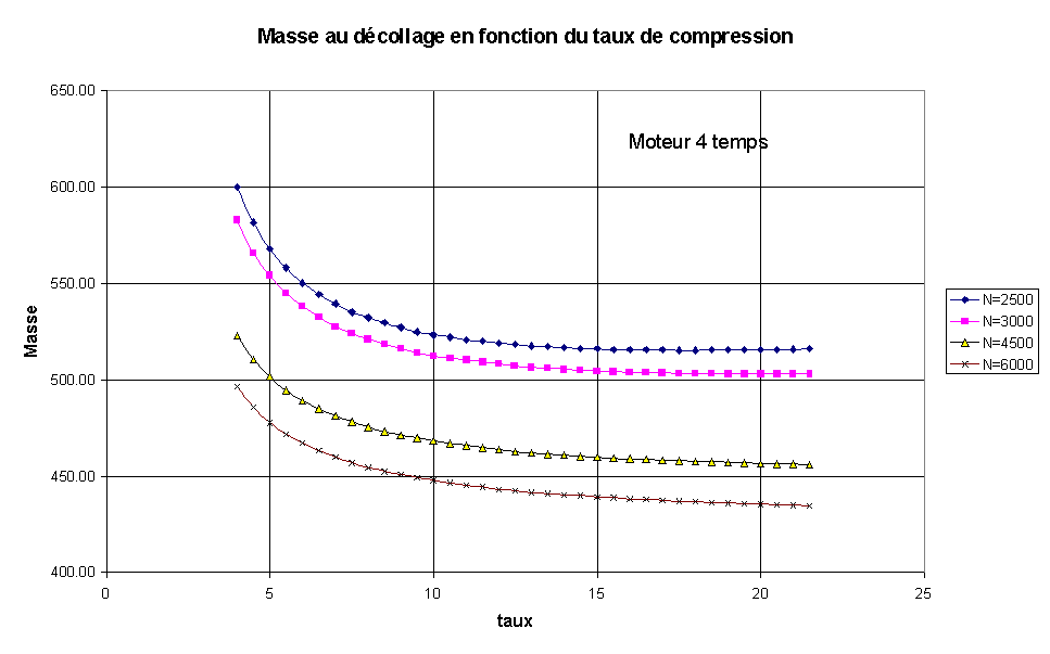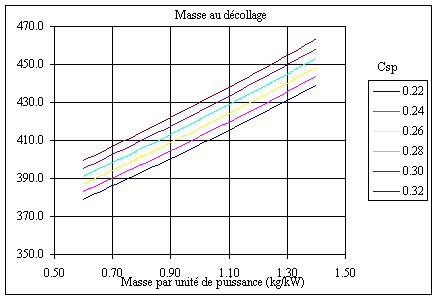 Ces courbes représentent la masse au décollage, donnée en kg, en fonction de la masse moteur par unité de puissance (kg/kW) et de la consommation spécifique donnée en kg/kWh, donc en fonction de la qualité du moteur.