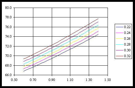 Les quatre courbes présentées ci-dessous décrivent l’évolution de la masse au décollage, de la puissance installée, de la surface aile nécessaire, et de la masse de carburant à emporter en fonction de deux paramètres moteur influents : Consommation spécifique et masse par puissance unitaire, et de la qualité aérodynamique et massique de la cellule. On s’aperçoit qu’en améliorant ou en dégradant ces derniers paramètres, on influe nettement la masse au décollage, (ainsi que la puissance installée).