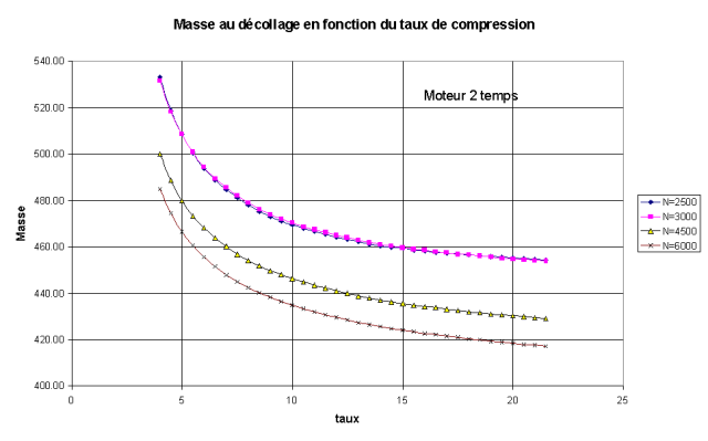 Dans le modèle global, il a été introduit une contrainte imposant dans les deux cas de moteurs l’utilisation d’un réducteur à partir d’un régime de rotation de 3000 t/mn. Il apparaît clairement sur la courbe concernant le moteur 2 temps que le réducteur n’apporte pas d’amélioration. à 3000 t/mn. Les moteurs 2 temps actuels, ne fonctionnant qu’avec un taux de compression inférieur à 7 sont susceptibles d’être nettement améliorés en accroissant ce taux à 10, voire à 13.