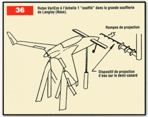 D’autres résultats intéressants concernent les essais en basse vitesse d’un Rutan VariEze, à l’échelle 1, dans la grande soufflerie de Langley (veine elliptique de 9 x 18 m) de la Nasa, soumis à une projection d’eau simulant une forte pluie sur le canard (Fig. 36). Les projections furent d’abord simulées par une transition artificielle à 5% des cordes.
