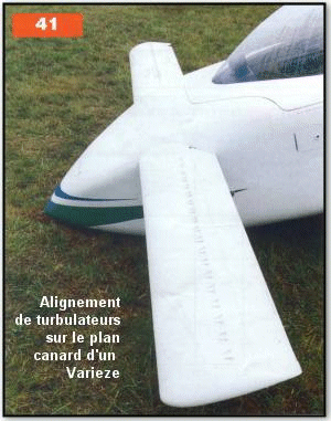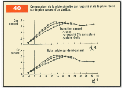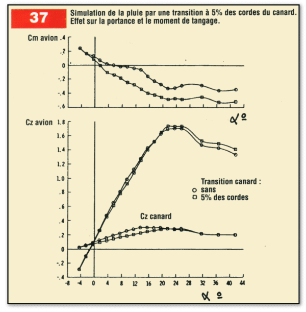 La figure 40 montre l’effet réel de la pluie, sur un demi-canard seulement comme indiqué sur la figure 36, et on retrouve les effets de la transition forcée réalisée au moyen de rugosités réparties ("courbes pluies" situées entre courbes lisses et courbes 5%). Des "turbulateurs" (petites ailettes en flèche), disposés à l’extrados de ce type de profil, permettent de corriger ce problème en déclenchant des petits tourbillons sur toute l’envergure du plan canard (Fig. 41).