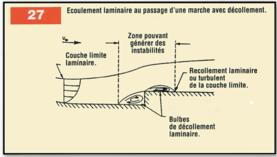 Un autre type d’imperfection de surface fréquemment répandu sur les avions légers (ou même plus gros !) est le défaut de type marche" (ou rainure), caractérisé essentiellement par une hauteur de désaffleurement et qui malheureusement pullule de façon pratiquement incontournable sur les surfaces aérodynamiques (portes de visite, joint de verrière, trappes de train, bouchons de réservoir, ... etc). La figure 27 montre les caractéristiques schématiques d’un écoulement laminaire avec décollement au passage d’une marche. Les deux bulbes de décollement laminaire, avant et après la marche, peuvent produire des instabilités au-dessus et après ces deux bulbes. Un critère a été établi pour déterminer la hauteur de marche critique. Il consiste à calculer un nombre de Reynolds en prenant comme longueur la hauteur de marche ou la largeur de la rainure, et comme vitesse la valeur "infini amont".
