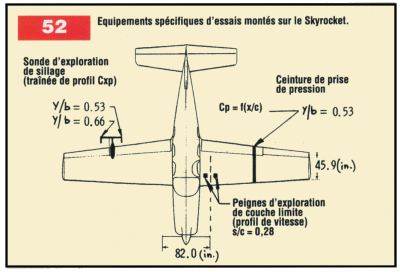La figure 52 présente un plan du Bellanca Skyrocket avec les équipements d’essais spécifiques (sondes de sillage, "ceinture de prises de pression", et peigne de pression totale de part et d’autre du sillage hélice), ayant permis d’effectuer les mesures dont les résultats sont présentés dans cet article. Des visualisations, toujours par sublimation d’un film d’acénaphtène, ont été aussi effectuées sur la voilure d’un Rutan LongEZ.