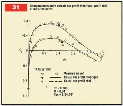 Nous venons de voir les trois types d’imperfection de surface les plus répandus, pouvant intervenir sur le point de transition : rugosité, ondulation, et désaffleurement de type marche ou rainure. Avant d’aborder l’influence des "éléments extérieurs", il reste à dire quelques mots sur le respect de la forme fabriquée comparativement au dessin de départ (profil théorique par exemple). l’épaississement du bord de fuite d’un profil pour des raisons de fabrication (bord de fuite théorique d’épaisseur nulle), s’il est effectué progressivement, ne change pas sensiblement les répartitions de pression, mais il est toutefois conseillé d’effectuer cette modification à l’intrados. Par contre, toute modification locale touchant la pente et/ou la courbure peut apporter des modifications assez conséquentes aux répartitions de pression et aux points de transition. La figure 31 montre une comparaison obtenue entre des répartitions de pression calculées sur le profil théorique de base Naca 63 115, celles mesurées en vol du même profil équipant le Bellanca Skyrocket, et celles calculées à partir du profil réel de cet avion utilisé aussi comme banc d’essai volant par une équipe de la Nasa.