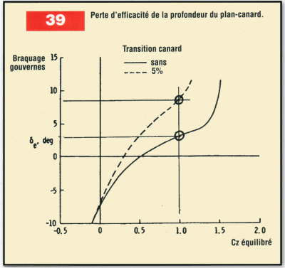 Ce décollement de bord de fuite entraîne aussi une perte d’efficacité de la gouverne (profondeur sur le canard), comme on peut le voir sur la figure 39. Pour un même Cz "équilibré avion", le braquage de la gouverne en transition déclenchée (pluie) est plus important - phénomène expérimenté en vraie grandeur sous des nuages de pluie par des pilotes de VariEze.