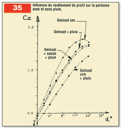 L’effet de la pluie tombant sur un profil laminaire a été étudié au MIT (Réf. N°8) sur un profil Wortmann FX-67-Kl7O, le nombre de Reynolds calculé sur la corde est de 350.000, et la précipitation réalisée en soufflerie est de 440 mm d’eau par heure. Ce profil a été soufflé avec trois types différents de revêtement pour simuler une "mouillabilité variable". Une surface "mouillable" voit le liquide s’étaler complètement sur la surface avec un angle de contact de 0°. A l’opposé, une surface non "mouillable" présente un angle de contact de 180°, et le liquide reste à la surface sous forme de goutte. Des valeurs intermédiaires sont envisageables. Lors de l’expérience, la surface de base était un gelcoat époxy, poncé soigneusement au grain 600, donnant un angle de contact de 53°. Une surface non "mouillable" a été obtenue en enduisant le profil avec de la cire, et un revêtement intermédiaire a été obtenu en savonnant la surface du profil. Les figures 34 et 35 montrent les résultats obtenus : 75% de réduction de finesse max entre le profil de référence (sec) et le profil ciré (non mouillable), et "seulement" 45% entre le profil sec et le profil savonné.
