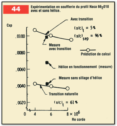 Les résultats montrent (Fig. 44) une augmentation de 60% de la traînée pour le profil immergé dans le sillage par rapport au profil de base dans les mêmes conditions d’essais. Ce supplément de traînée ne représente pas la perte totale de laminarité, car une transition forcée à 5% des cordes provoque une augmentation de 150% de la trainee de profil dans les conditions de l’essai. Autrement dit l’interaction du sillage d’hélice sur le profil représente moins de la moitié de l’augmentation de traînée due à une perte quasi totale de laminarité. La Nasa prévoit des études plus approfondies sur ce sujet, afin de mieux comprendre la phénoménologie d’une part, et de mettre au point des méthodes de calcul permettant si possible de réduire la traînée des surfaces immergées dans un sillage d’hélice d’autre part. Ce dernier résultat permet de penser maintenant que l’architecture "avion classique avec hélice à l’avant" n’est pas si pénalisante sur le plan de la trainée qu’on pourrait l’imaginer.